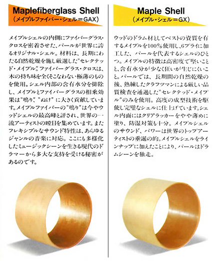 一方のGXシリーズは、6プライに加工した密度の高いメイプル材を100%使用し、高度な成形技術を駆使して完璧なシェルに仕上げられている。
