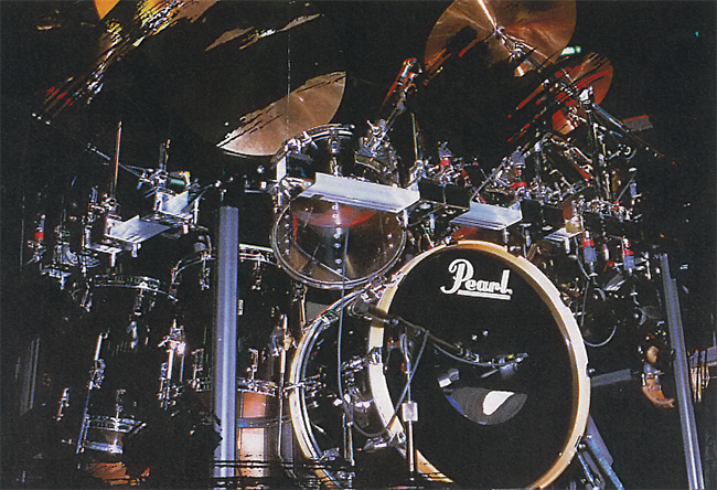 脚部は丸脚に仕様変更が見られるものの大きな変更無し。が、気になるものが、密かに映り込んでます!(笑) そうです、当時は市販されてなかったはずの黒色のタムホルダー写真。それに、ジェフのキットと思われるタムの内側がブラック塗装に!、プラス、なぜか、バスドラフープがナチュラル・カラー(笑)