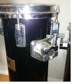 ■口(4) 新型のタムホルダーブラケットは、左側は六角ピンか何かで、ある程度の径を見越して、稼働はするものの固定型で、パイプが差し込まれたら右側のウイングナットで締め付ける方法。