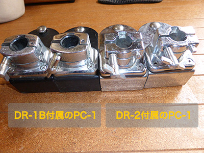 ■口左がDR-2、右がDR-1Bの付属のアダプター 両者違いは、タムホルダーベース自体の止め方とホルダーロックの方法が変更になっています。タムホルダー自体は3本のネジ止めに変更はありませんが、DR-1Bでは手前の一本が、下からのボルトが貫通式になっています。ホルダーのロックは2本締めつけから1本締めつけ、それに伴い、ホルダー差込部に黒いナイロンブッシュが装着されるようになりました。