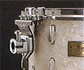 (注4)パールカタログ 1989年 Vol.1より転載 名器とうたわれたスネアドラムを、現代にマッチしたサウンドでよみがえらせたカスタムクラシックシリーズ。最新テクノロジーによって、厳選されたメイプル材を完全1ピースの単板シェルとして完成させたました。音響特性に優れる反面、加工の困難なメイプルを7.5mm厚の真円に成型、レインフォースメントなどの補強を必要としない完全な単板シェルは、メイプルのサウンドをあますことなく引き出します。パーツも原点から吟味しなおし、ブラスフープやゴールドプレーテッド・ハイカーボンスナッピーなどを導入。サウンドばかりでなく、ルックスもひときわ鮮やか。ヴィンテージの単なるレプリカではなく、新しいスネアドラムサウンドを提示する画期的なシリーズです。 |