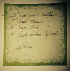 20" ライド・シンバル ジルジャン、19" クラッシュ・ミディアム ジルジャン、18" クラッシュ シン・ジルジャン、14" パイステ ハイハットと書かれてますね。 例のdwのことを書いてあったサイトのシンバル情報を、というか、そのサイトのリンクです。 Jeff Porcaro--The Groove Master、Jeff's Drum Set History よっさん:これは凄い。朝からテンションMAX、ありがとうございました! Toshiさん:記事の内容がホントかどうか分かりませんが、リハに行ったとか言ってんだからホントの話しもあると思いますが、でも、読み応えのあるサイトです。マメにアップデートもされてるようで、ジェフとマイクの音源もあるけど、曲にして発売とはならなかったみたいですね。 ベイクド・ポテトの件…すみません、てっきりご存知だと思っていたので。 決して出し惜しみをしていた訳ではありません。この画像のシンバルって事なのかなぁ? 上にぶら下がってるジャンバーが欲しいですねw そういえば、ベースの人も亡くなっちゃいましたね。